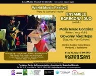 ENSAMBLE EGRÉGORA DÚO. Nace en el 2013 partiendo del interés de ambos integrantes por enriquecer su formación vocal-instrumental y de educadores, investigando y profundizando en el estudio de varios géneros musicales del folclor colombiano, teniendo como prioridad la de la región andina. Puede evidenciarse en sus interpretaciones la influencia musical de cada uno, adquirida gracias a su experiencia y estudios. En sus propuestas mezclan estilos modernos con otros más tradicionales, caracterizándolos como un ensamble polifacético e innovador con arreglos propios, incluyendo obras inéditas y montajes de música española antigua e instrumental de diferentes periodos de la historia. Este proyecto lo complementan con danza española y otros instrumentos entre los que se puede nombrar el tiple y el violín. Egrégora Dúo se ha presentado en Medellín y Armenia.